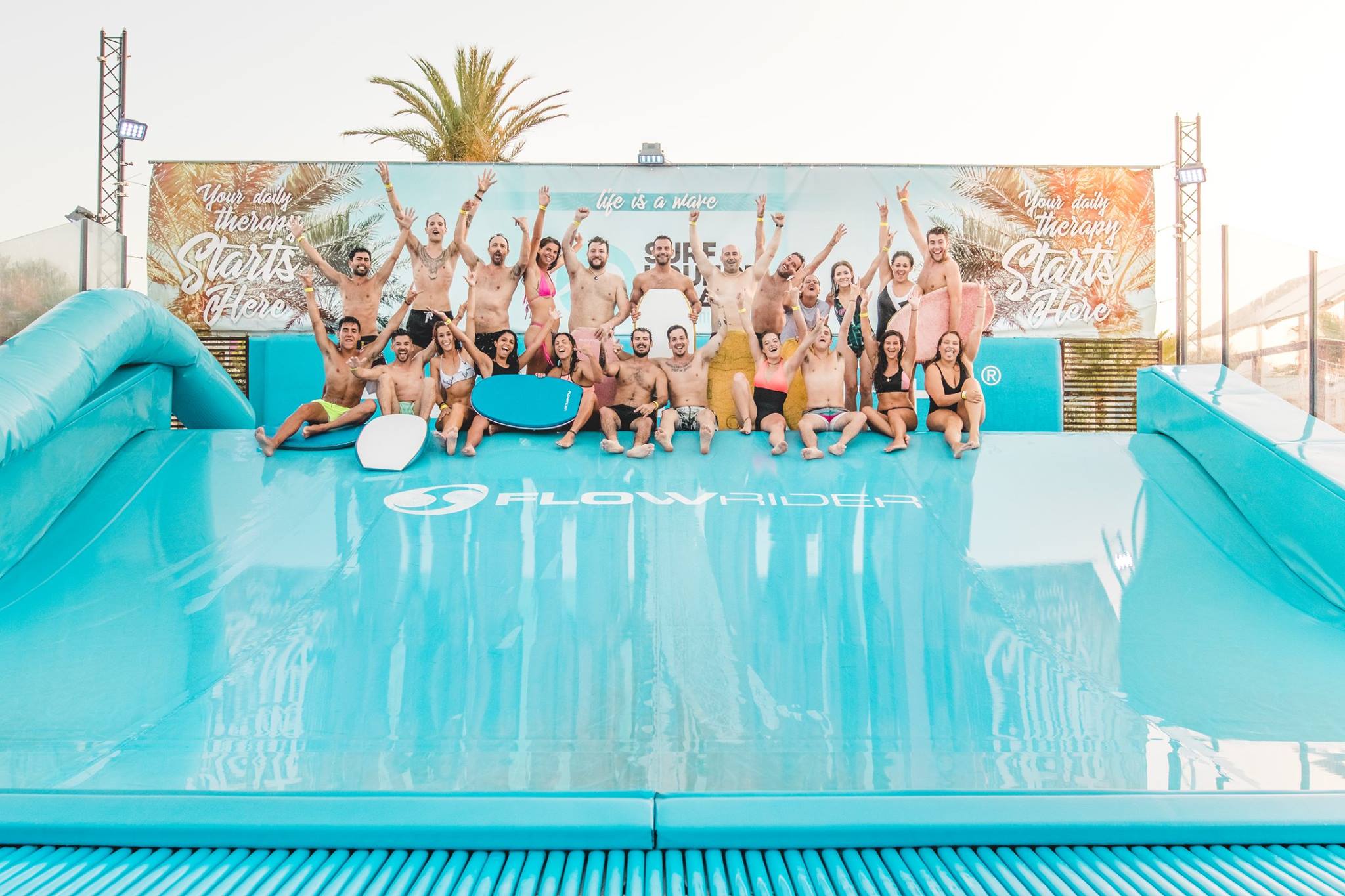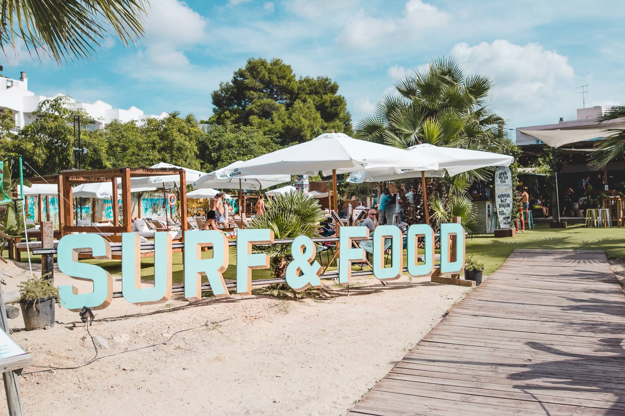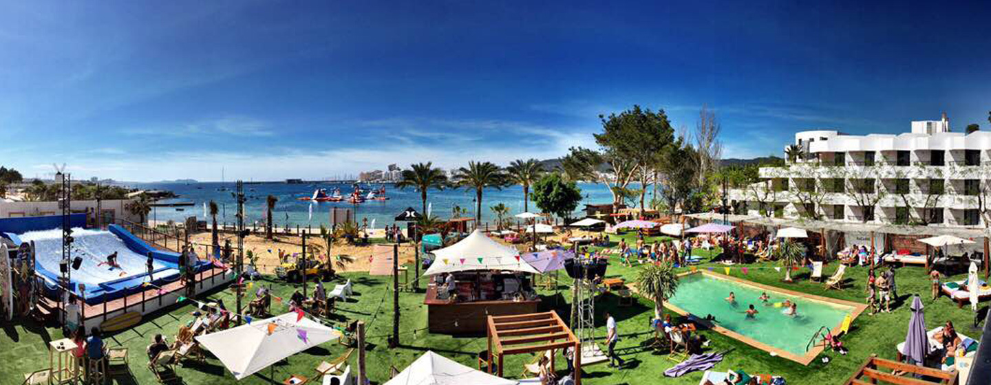 Le Surf House se trouve sur la baie de Sant Antoni, sur la côte ouest de l’île d’Ibiza. Situé en front de mer, c’est à la fois un beach club, un sport club, et un endroit où se détendre.