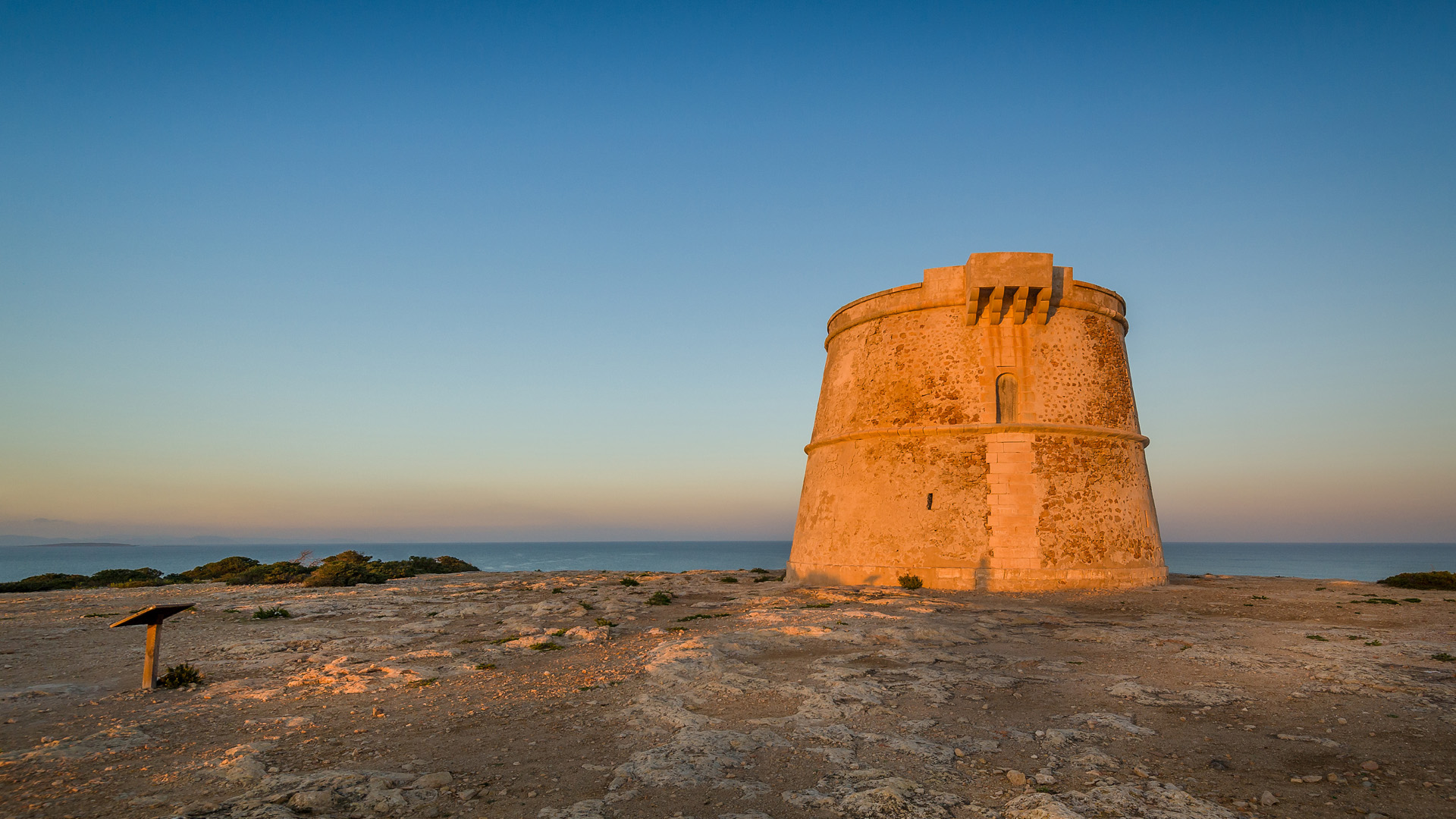 Depuis ce perchoir qui surplombe la mer, le site offre une superbe vue sur Ibiza et S'Espalmador.