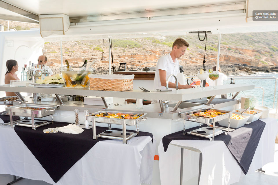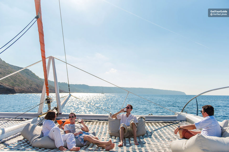 Rien de tel qu’une silencieuse navigation à la voile pour se détendre en se laissant glisser sur les eaux bleues de la baie de Palma. Le catamaran nous emmènera jusqu’aux plus belles criques majorquines (Cala Blava).