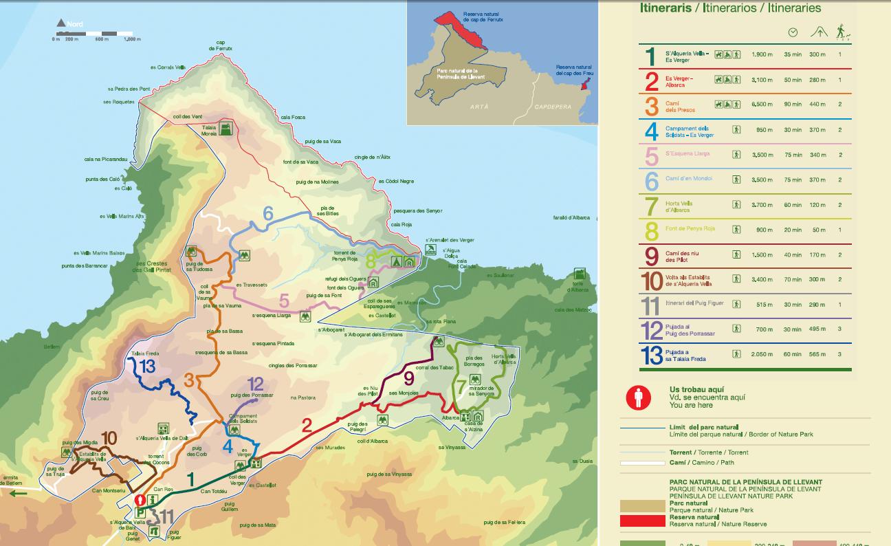 En 1999 le gouvernement des Îles Baléares acquit les fincas (propriétés) Albarca et Es Verger qui constituent la base de la création du Parc Naturel de la Péninsule de Llevant et des réserves naturelles du Cap de Ferrutx et du Cap des Freu déclarées Parc Naturel par décret 127/2001. Avec une superficie de 1671 hectares le parc occupe une grande partie de la péninsule de Llevant. L'environnement physique y est très varié : de hautes montagnes, des plages vierges (Arenalet des Verger, Arenalet d'Albarca, etc.) et des falaises. La végétation et la faune sont également d’une grande variété.