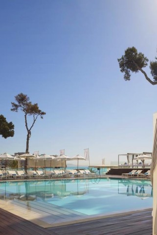 - Une piscine en forme de bulle, entourée de palmiers et de nombreuses chaises longues.