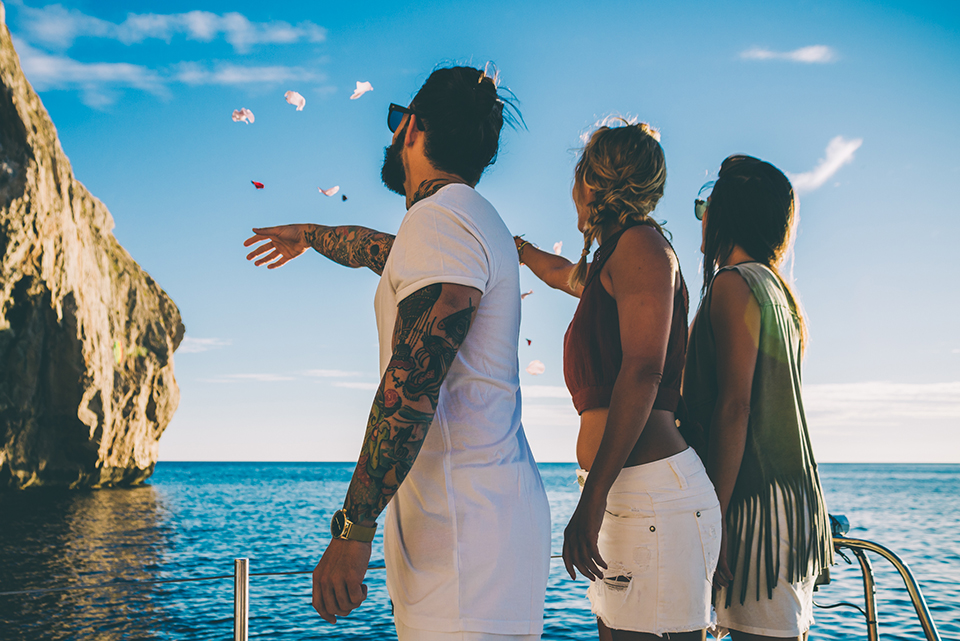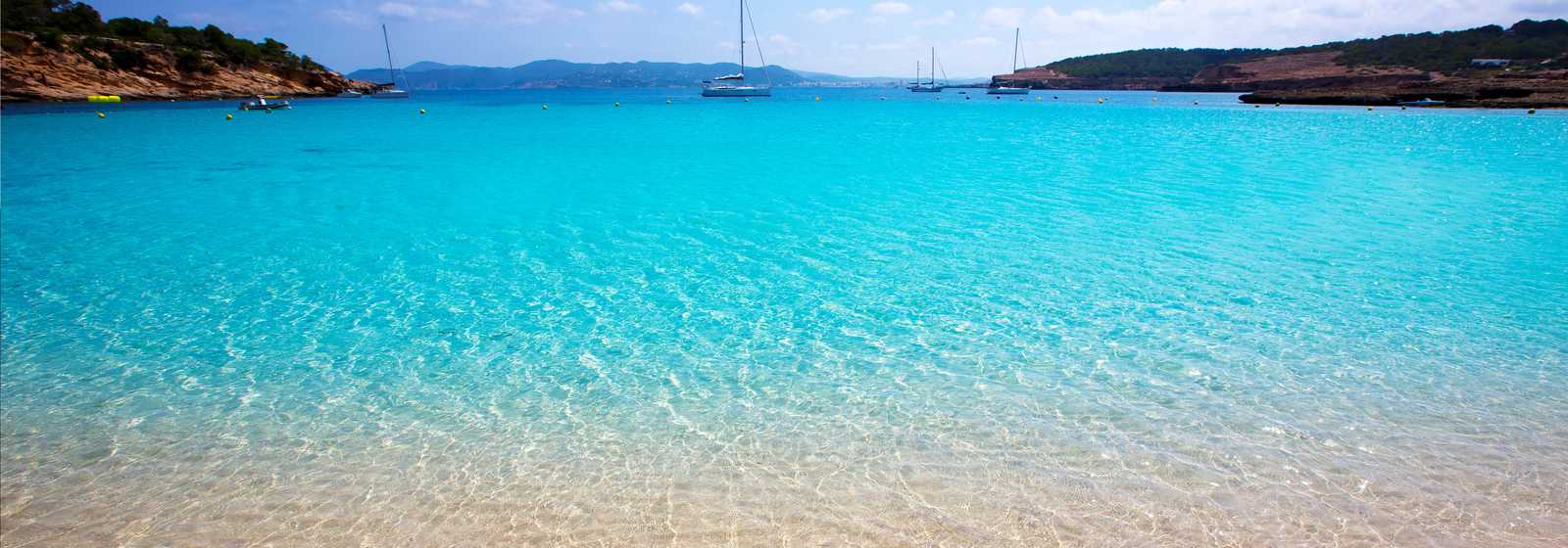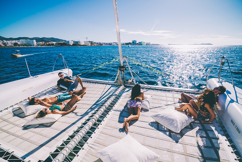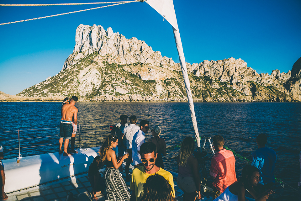 Naviguez en catamaran sur les eaux bleues d'Ibiza vers Cala Bassa où vous verrez l’une des plus belles criques d’Ibiza. C’est également le point de passage de nombreuses célébrités.