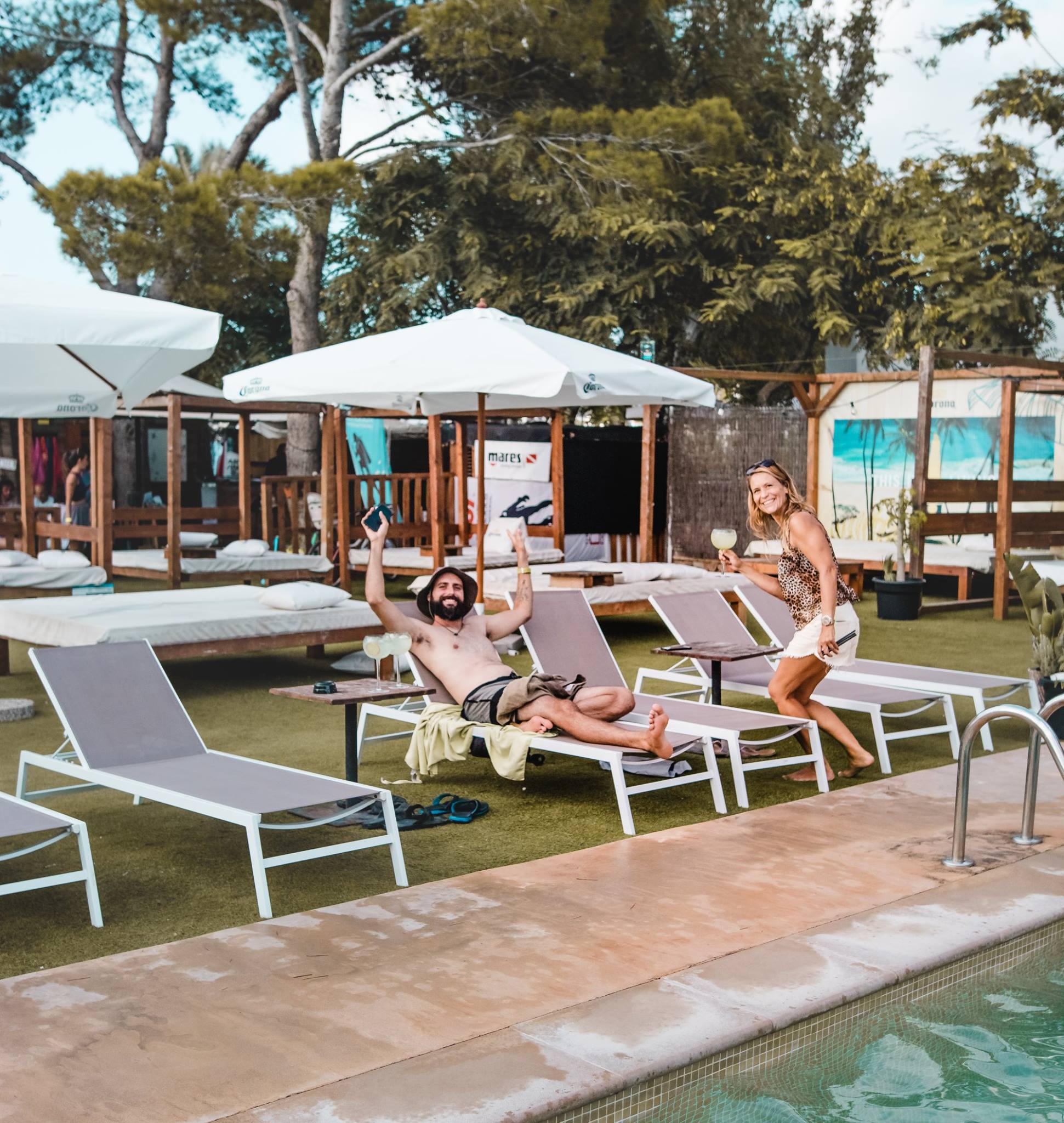 Le Surf House se trouve sur la baie de Sant Antoni, sur la côte ouest de l’île d’Ibiza. Situé en front de mer, c’est à la fois un beach club, un sport club, et un endroit où se détendre.