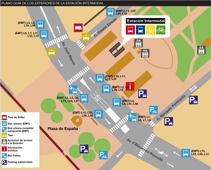 - Pour relier d’autres zones de l’île, vous devrez prendre la Ligne 1 de bus de l’EMT pour ensuite une fois à Plaza de España, vous dirigez à la gare routière de Palma.