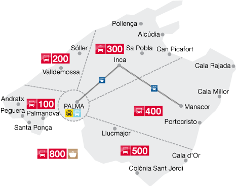 Vous pouvez récupérer une carte papier des lignes de bus qui sillonnent l’île, ainsi que de celles du train, au point d’information de la gare routière de Palma de Majorque :